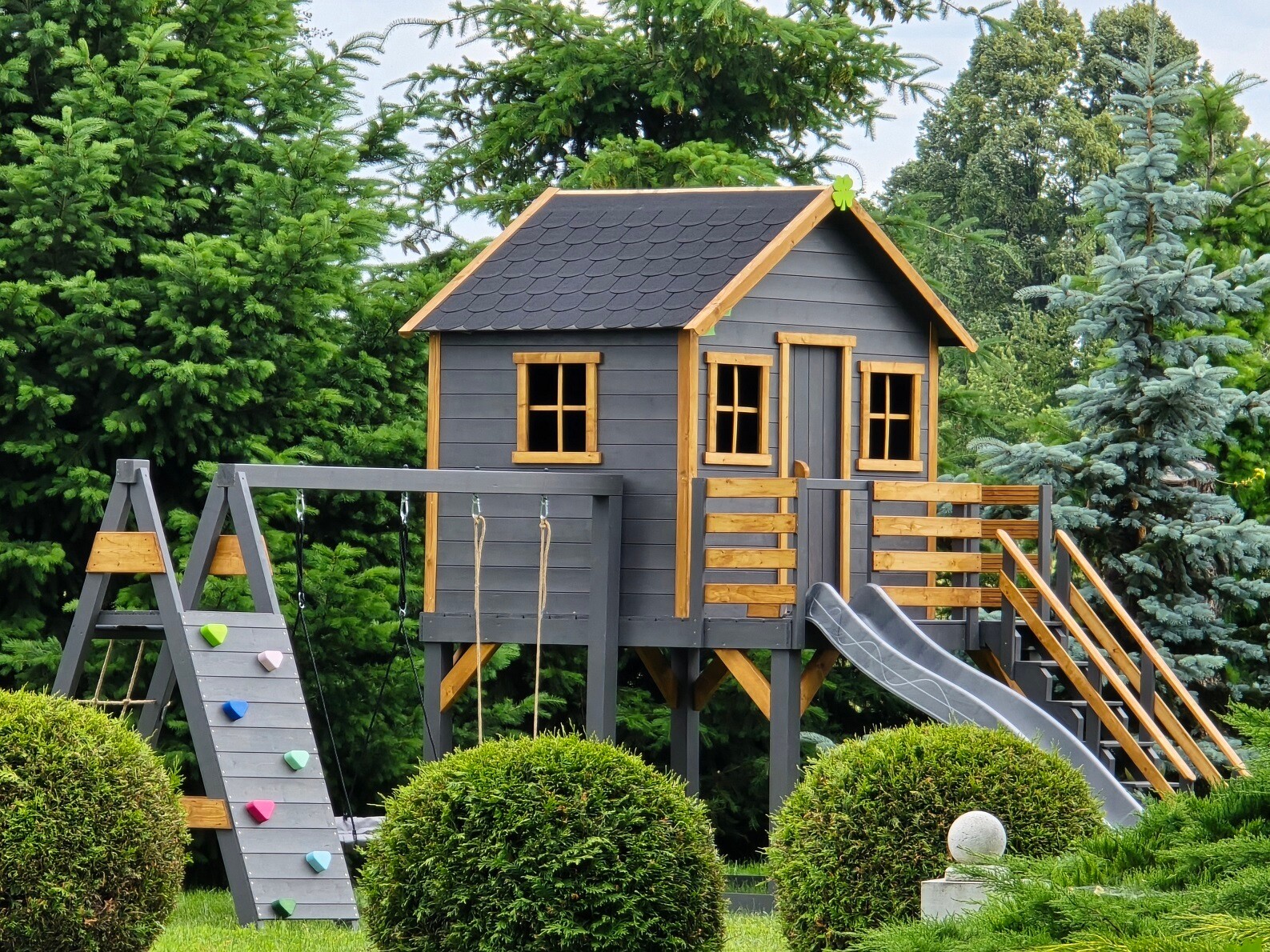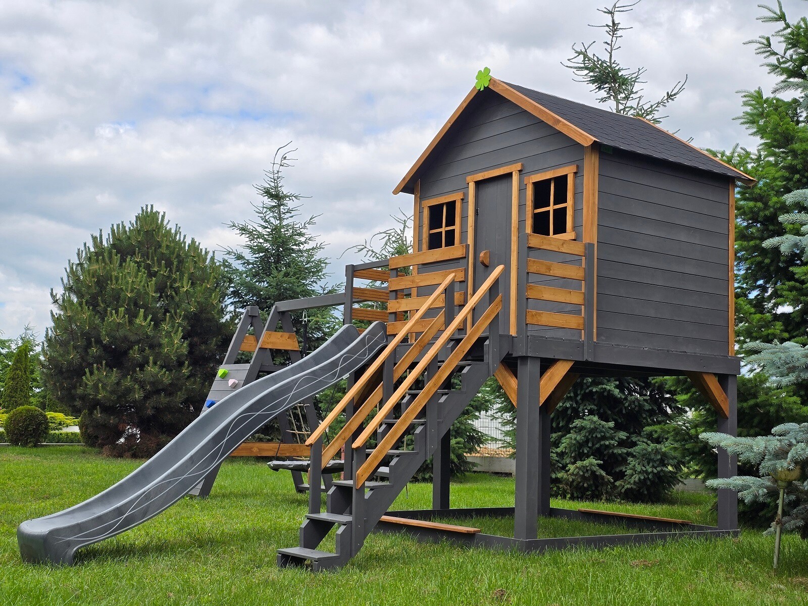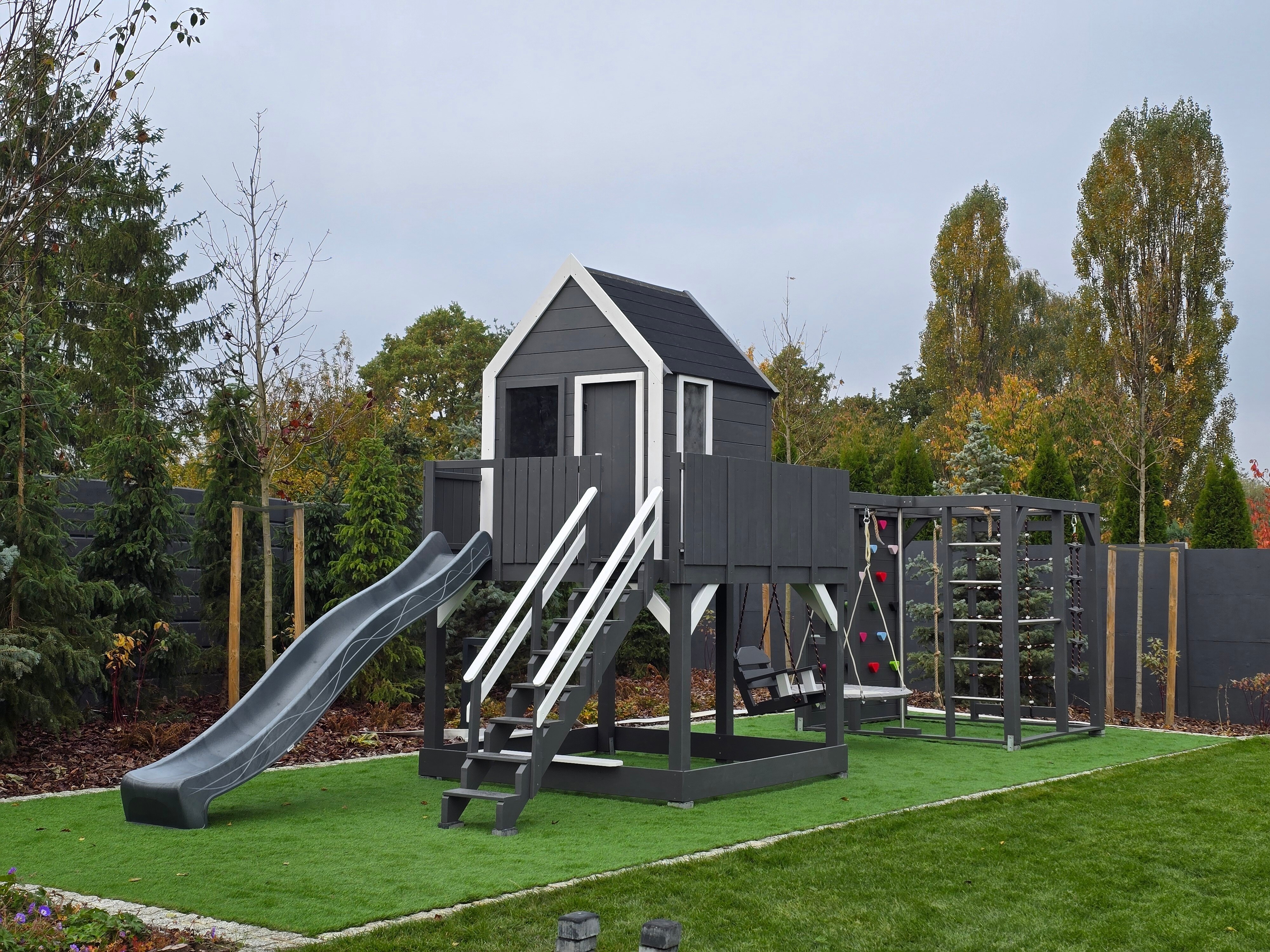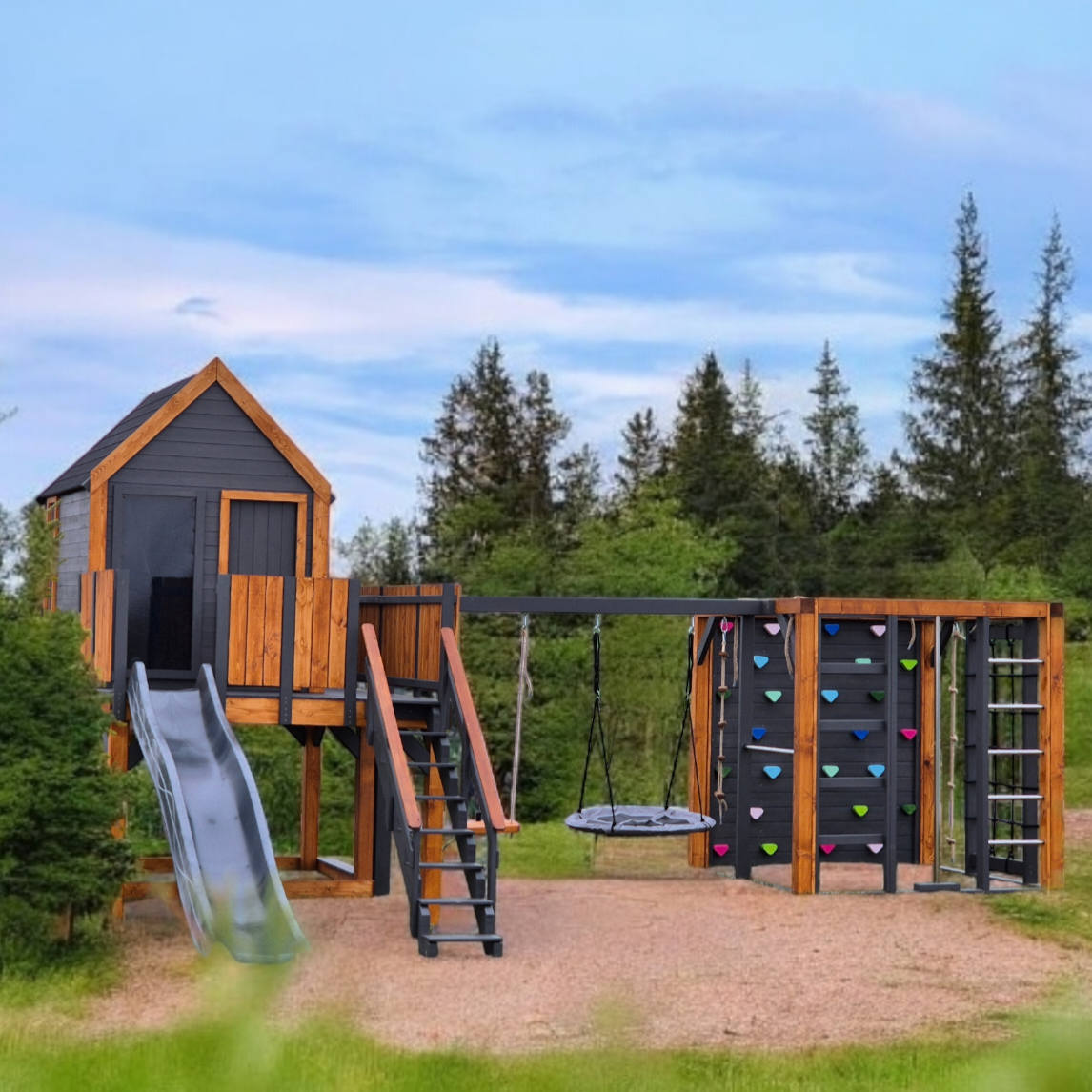 Klasyczny "prosty" domek z powiększonym podestem i ścianką wspinaczkową: