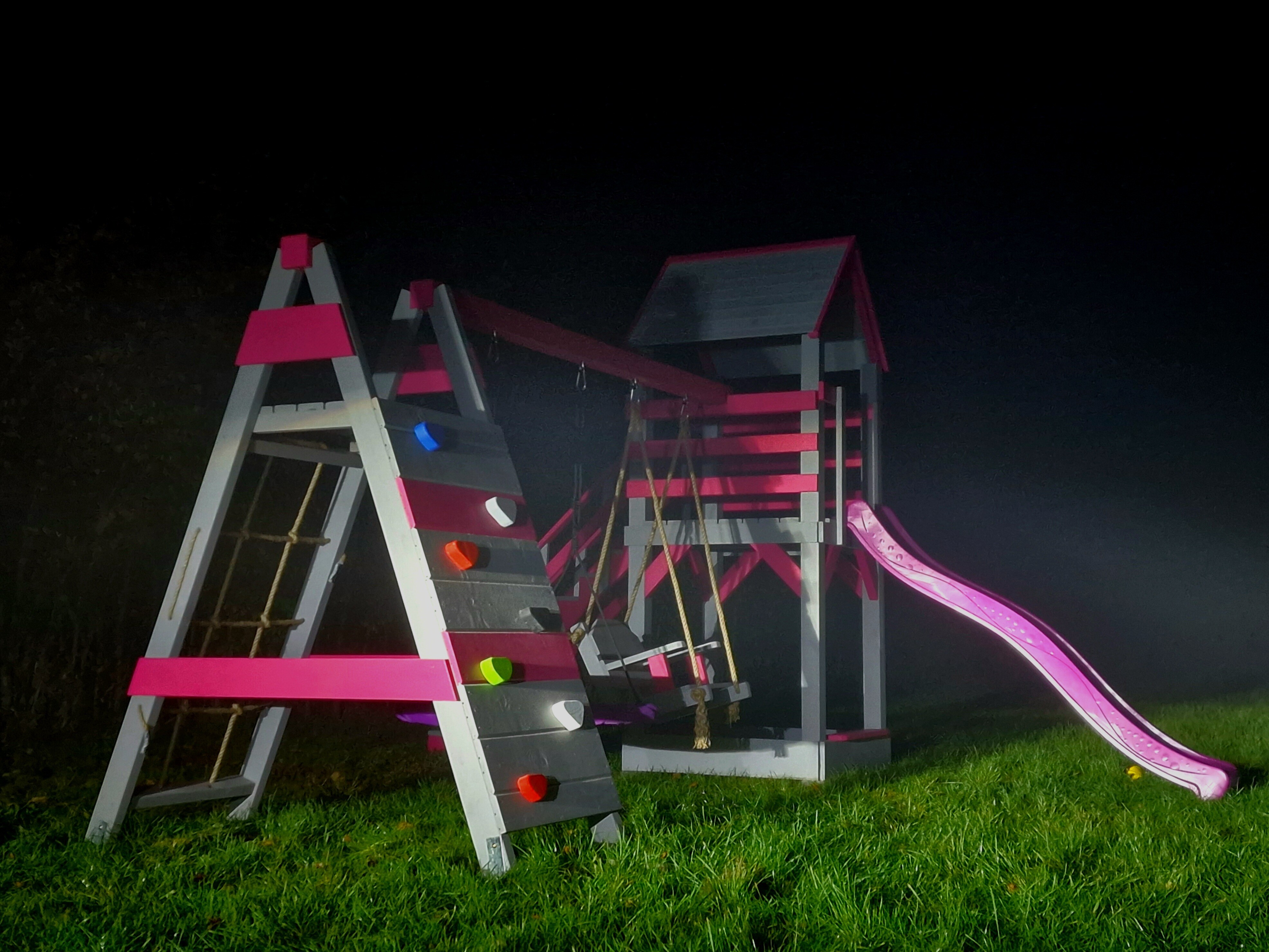 Ślizg oraz huśtawki dostępne są w kolorach: czerwony, szary, zielony, niebieski lub różowy.