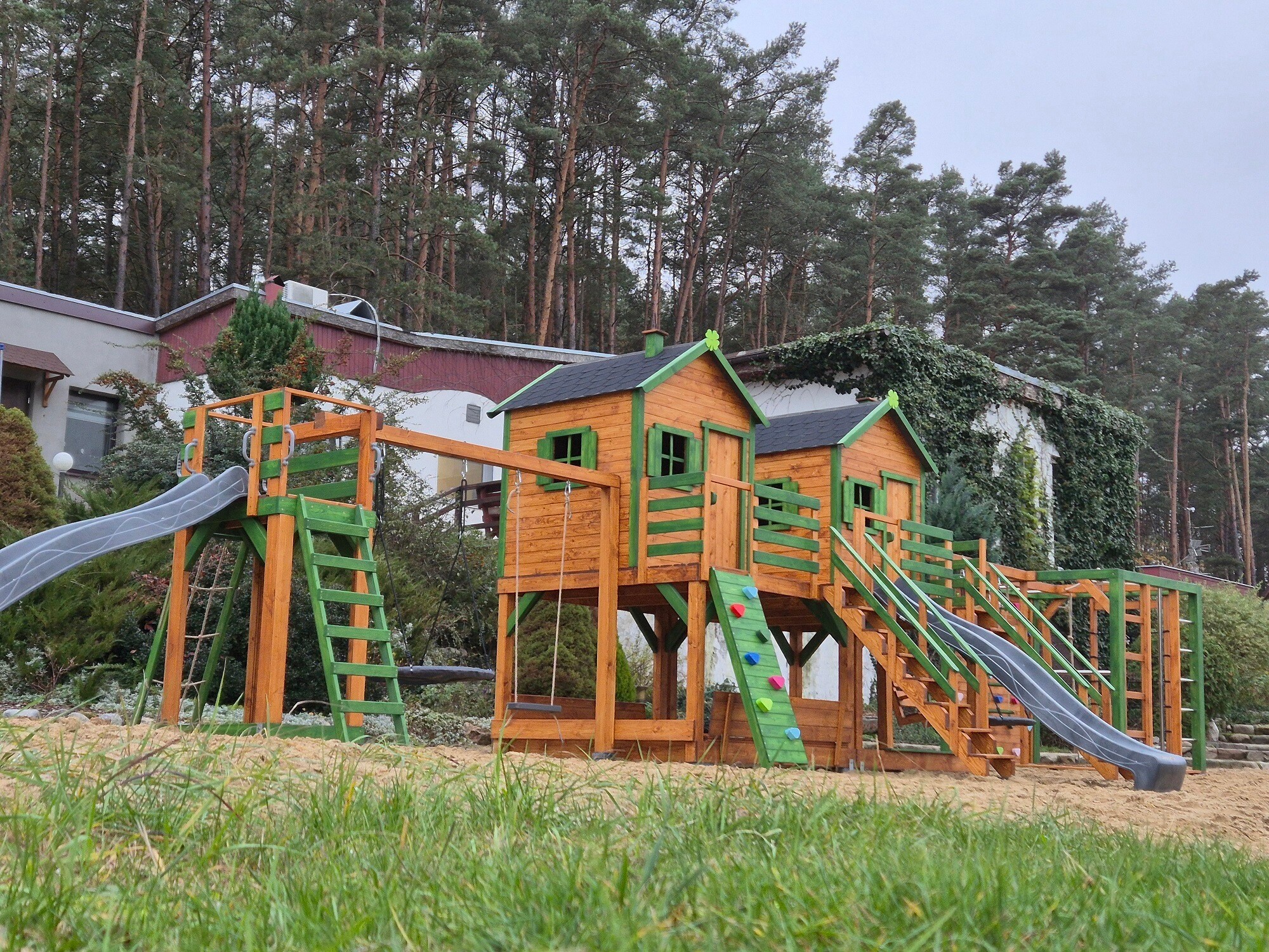 "Podwójny plac zabaw" Dwa domki z małpim gajem i huśtawkami: