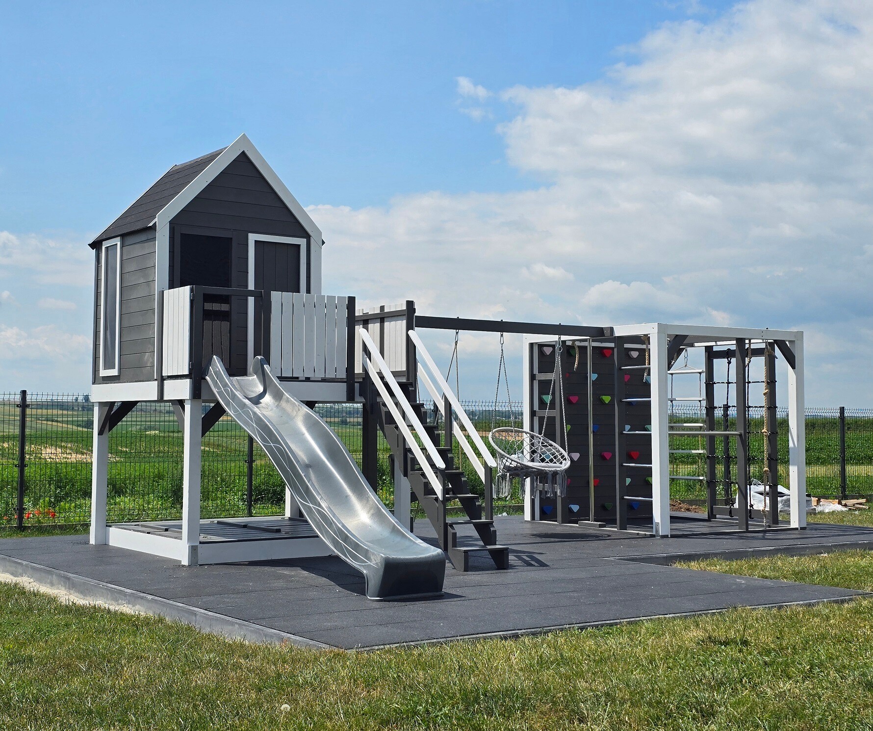 Klasyczny "prosty" domek na powiększonym podeście z małpim gajem i huśtawkami: