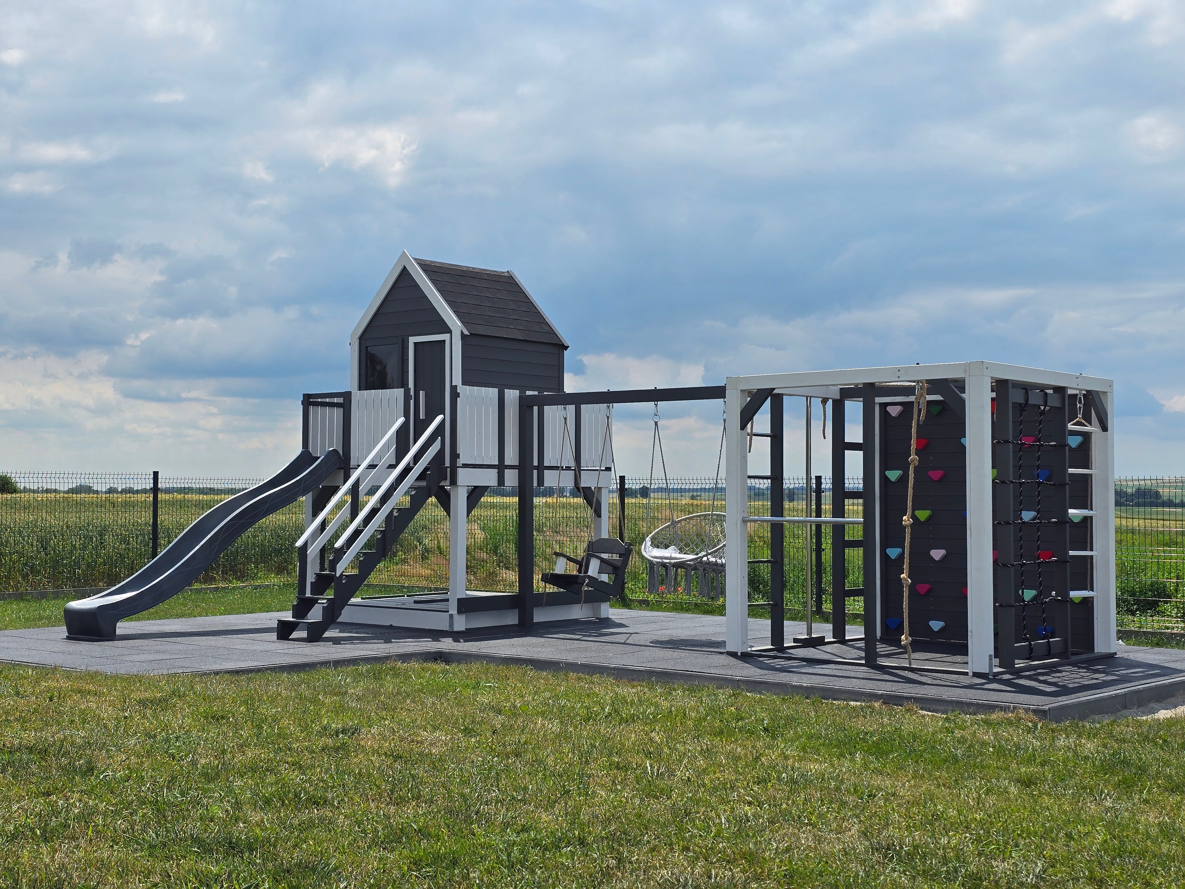 Ślizg, huśtawki, piaskownica, ścianka wspinaczkowa, drabinka, siatka linowa