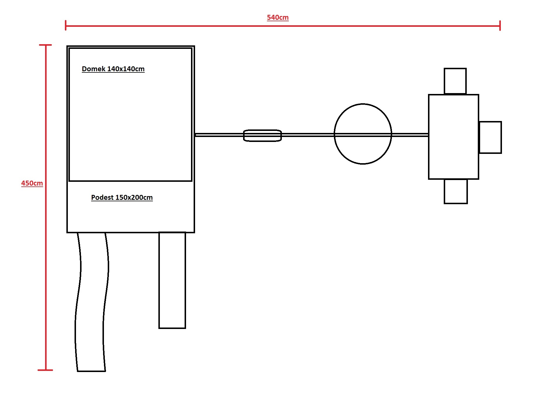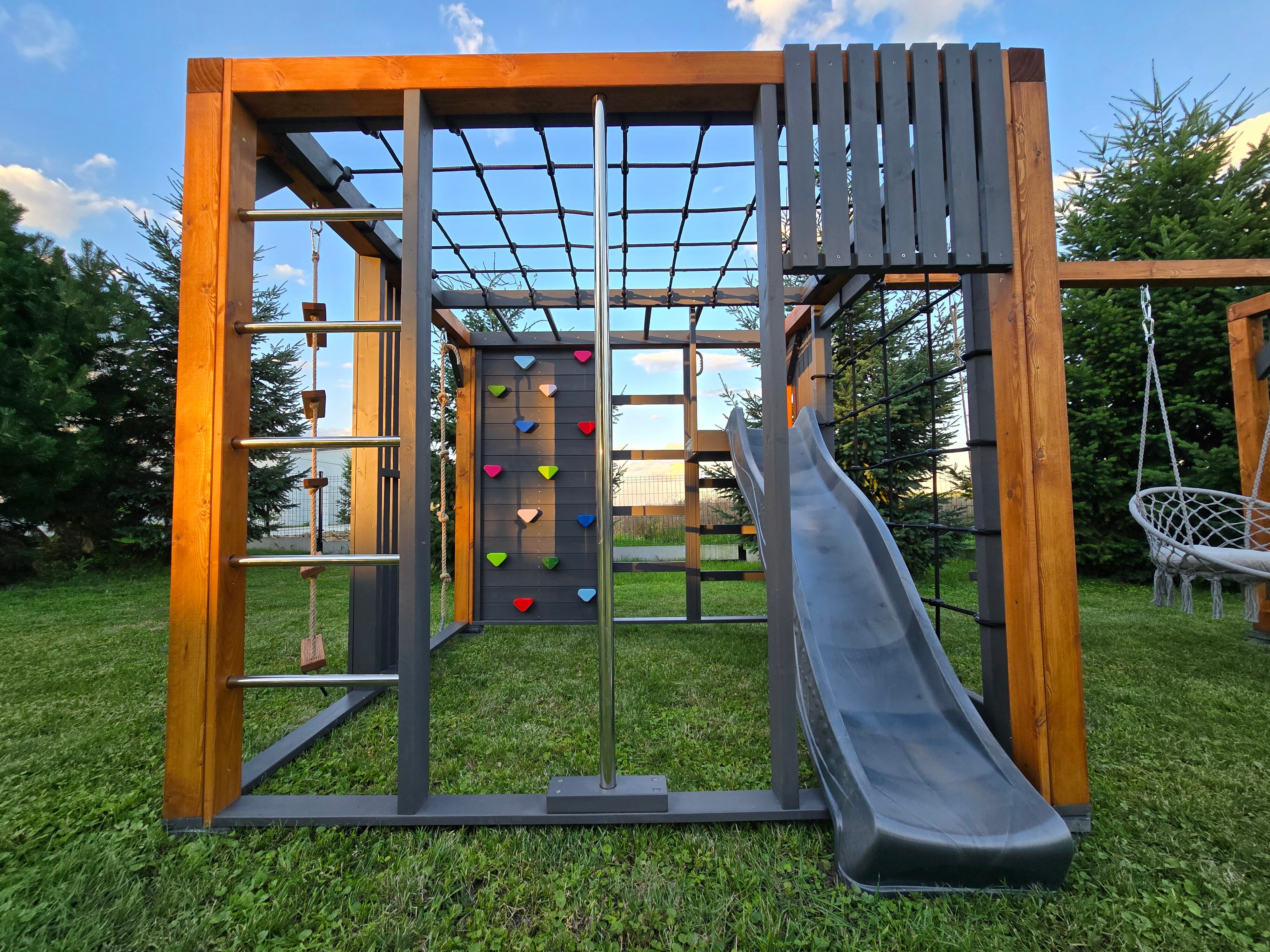 Podest 2x3m, ślizg, huśtawki, piaskownica, drabinka górna – pozioma, drabinka pionowa, drabinka siatkowa, rura strażacka, drabinka wisząca, szczeble drewniane, lina do wspinaczki, ścianka wspinaczkowa