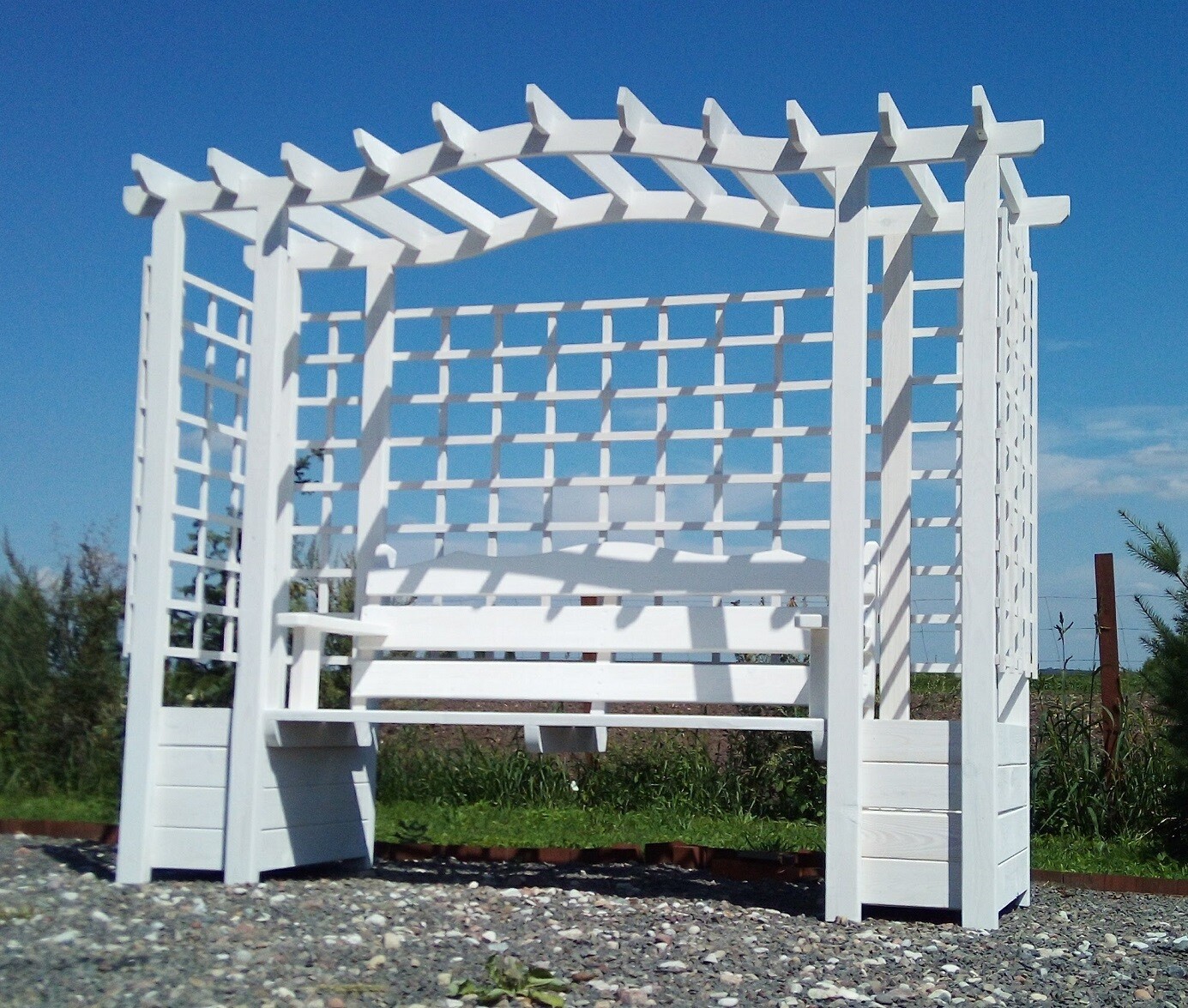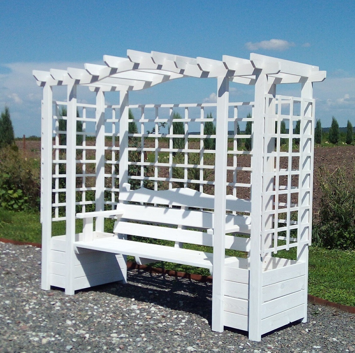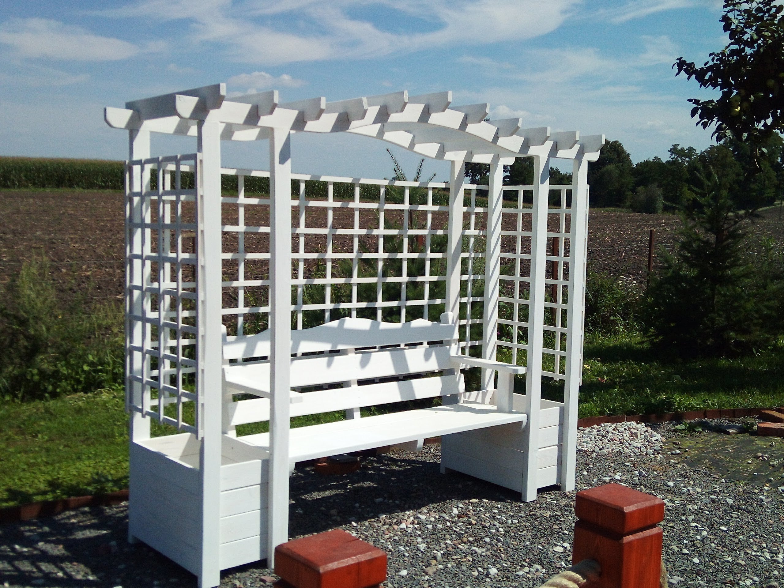 Pergola z ławką i donicami: